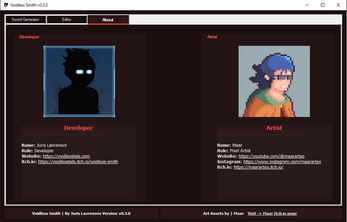 Polished UI: Dark “Hell” theme, responsive layout, and an About section with artist/dev cards.